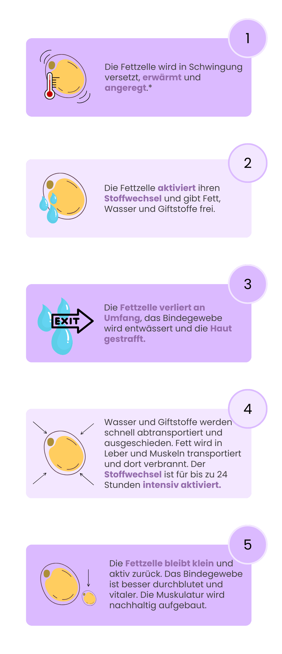 *Achtung! Die Fettzelle wird weder verletzt noch zerstört. Lediglich der Stoffwechsel der Fettzelle wird "aufgeweckt", damit der natürliche Fettabbau wieder ablaufen kann. Die Darstellung der Fettzelle dient ausschließlich der einfachen bildlichen Veranschaulichung. Eine Gewichtsreduktion auf der Waage setzt eine dafür geeignete Ernährung voraus.